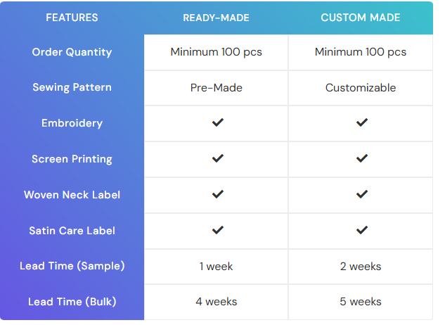 Ready-Made is suitable for small-scale companies, such as work wear and business events. The minimum order quantity, which is 50 pcs per style and fabric color, gives you the flexibility of not worrying about higher quantities. This plan is best for realizing your project quickly with shorter lead times and high-quality production. You don’t need to worry about the size chart as we offer the best regular and oversized patterns developed on data from hundreds of projects.
