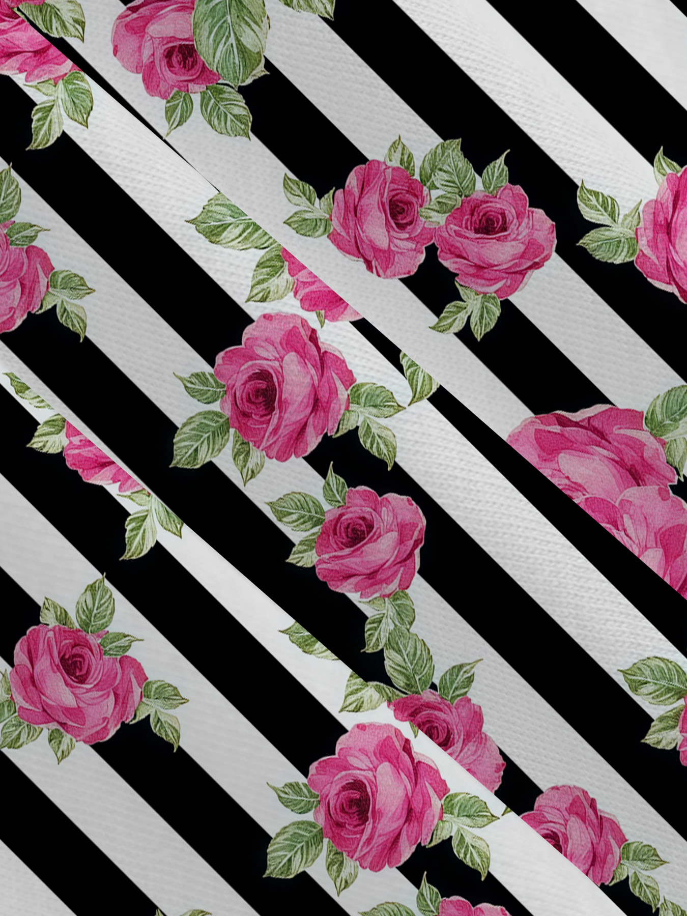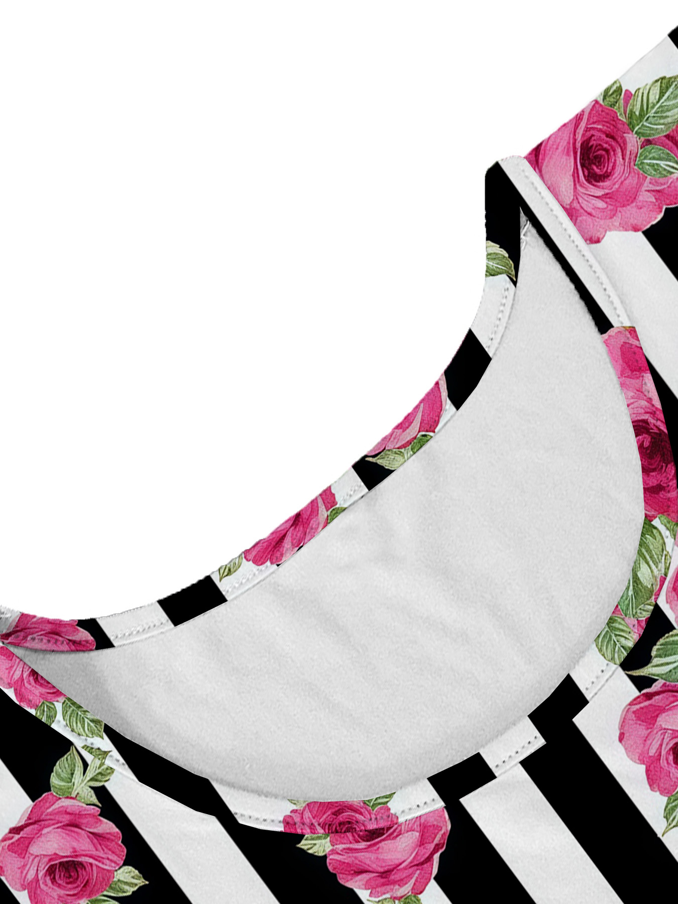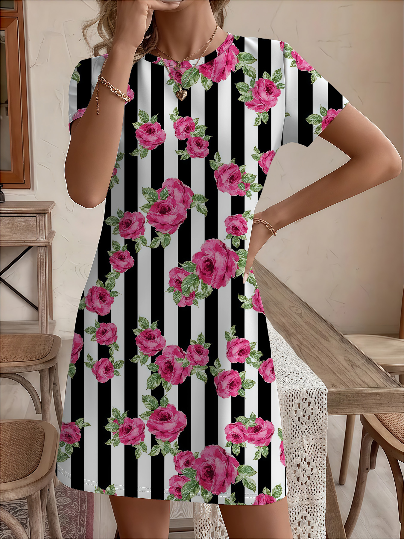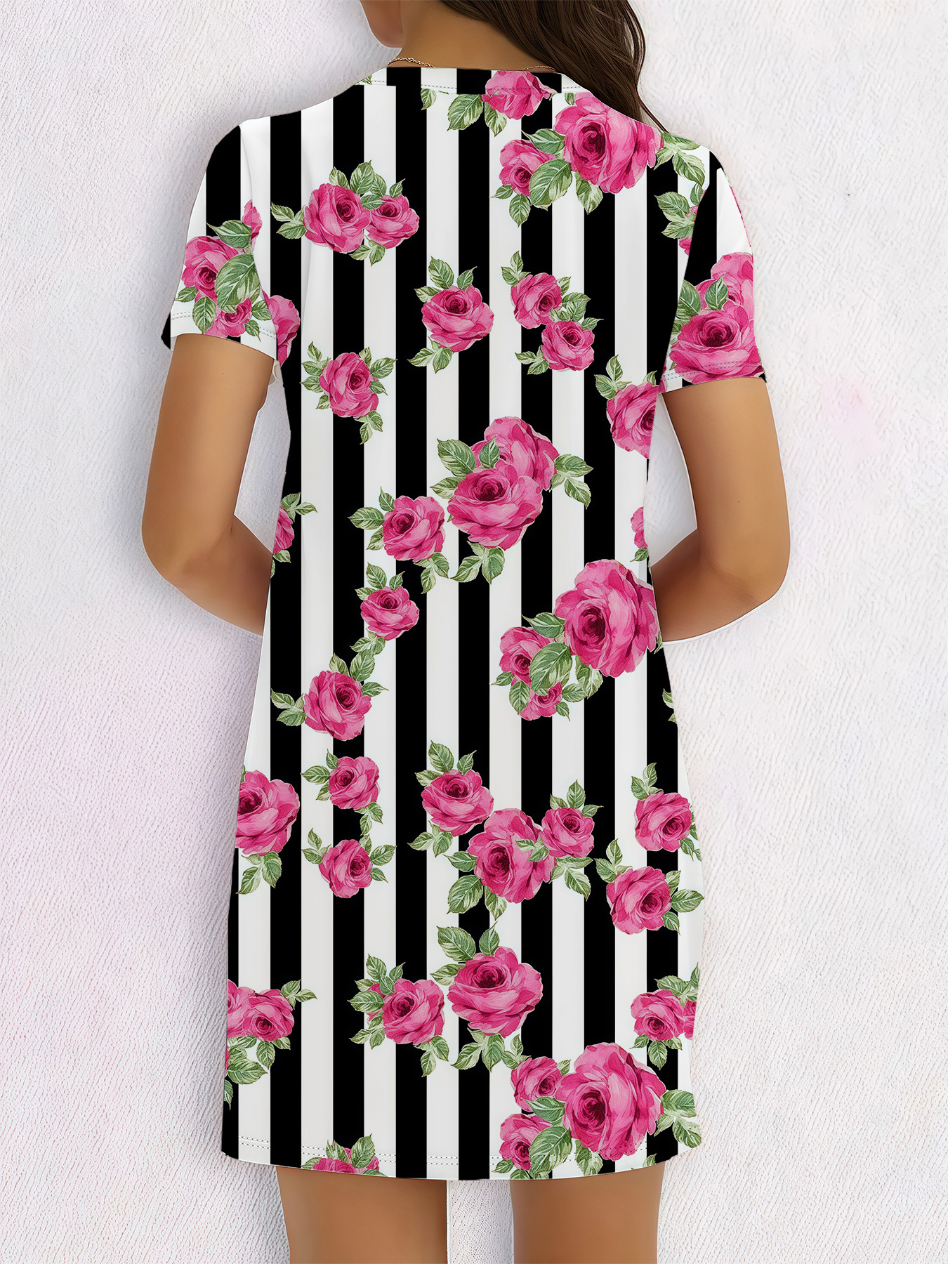 Women's autumn black and white striped flower short-sleeved dressWomen’s autumn black and white striped flower short-sleeved dress