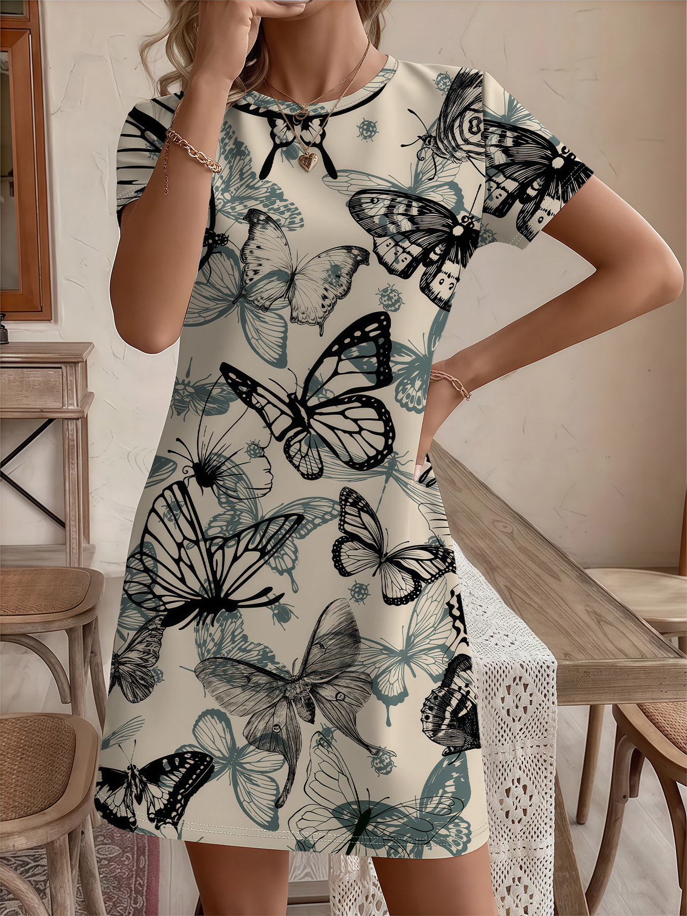 Women's autumn black full-printed butterfly short-sleeved dressWomen’s autumn black full-printed butterfly short-sleeved dress