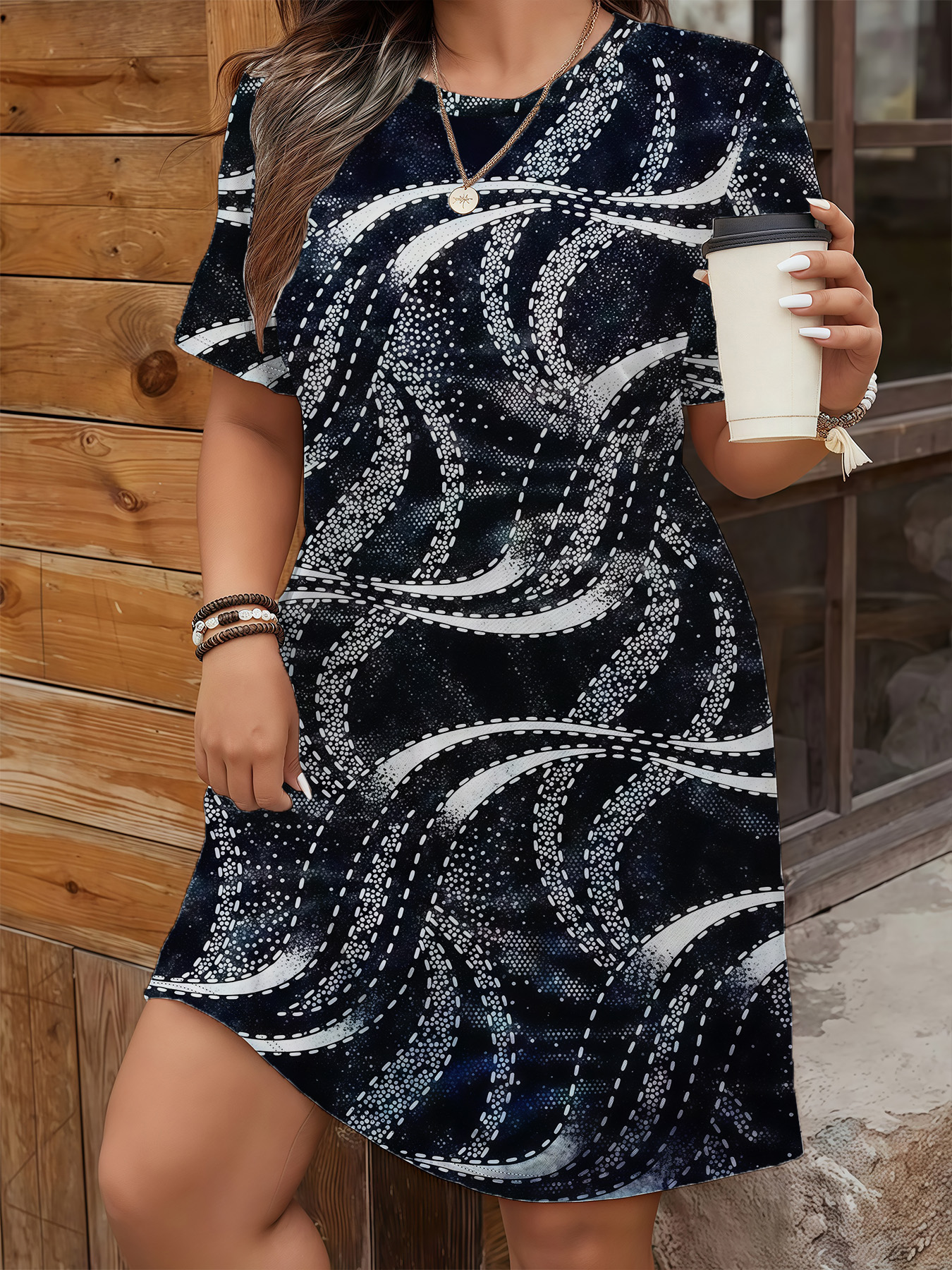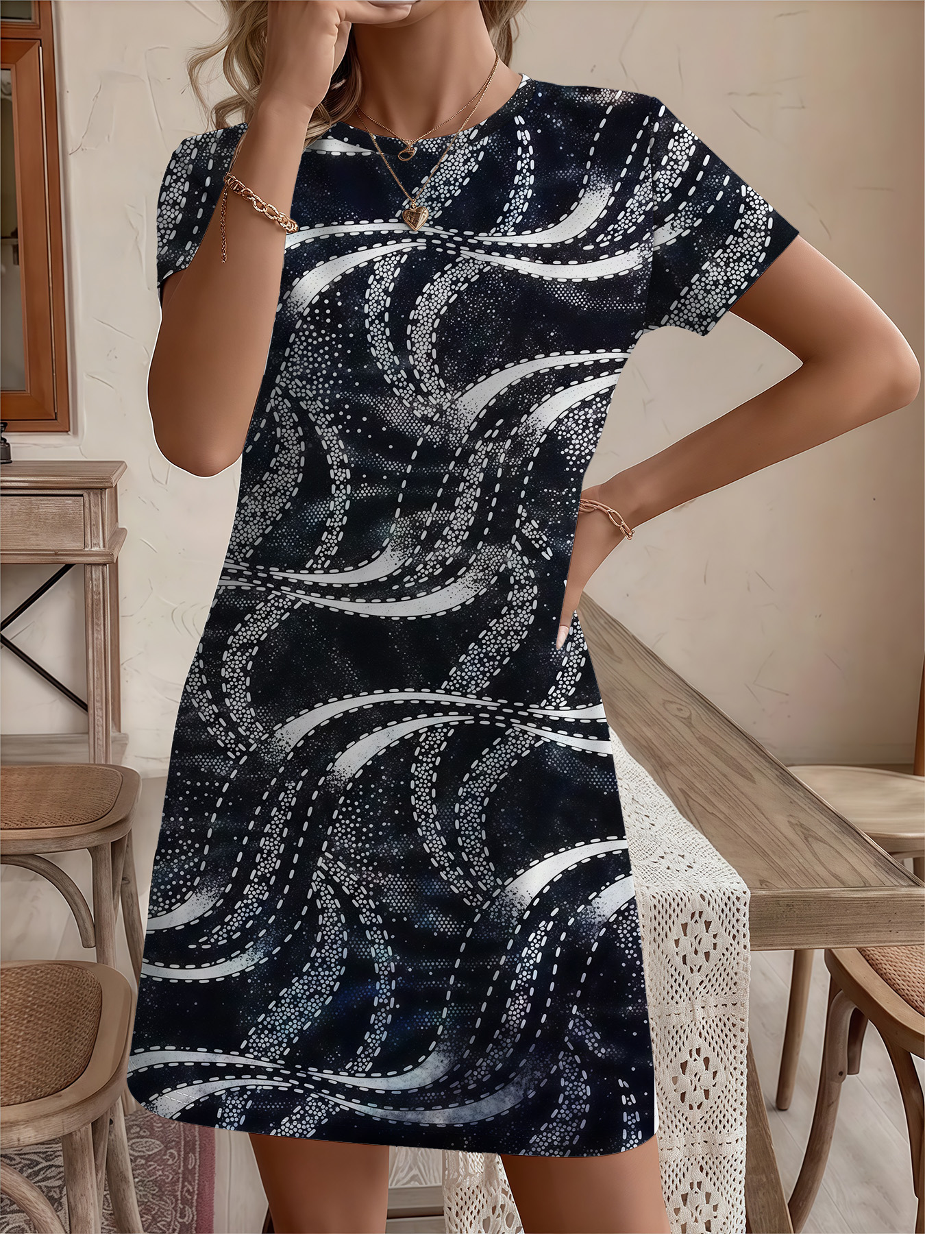 Women's autumn black line printed short-sleeved dressWomen’s autumn black line printed short-sleeved dress