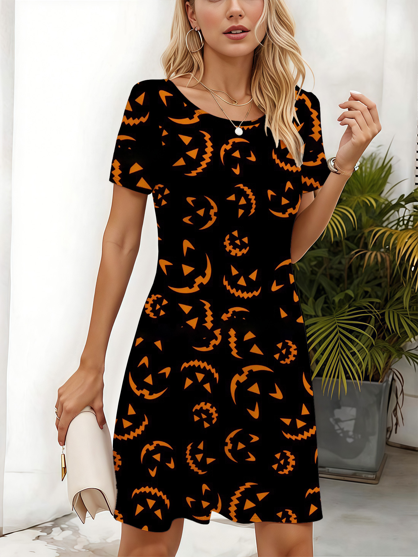 Women's autumn black smiley face printed short-sleeved dressWomen’s autumn black smiley face printed short-sleeved dress