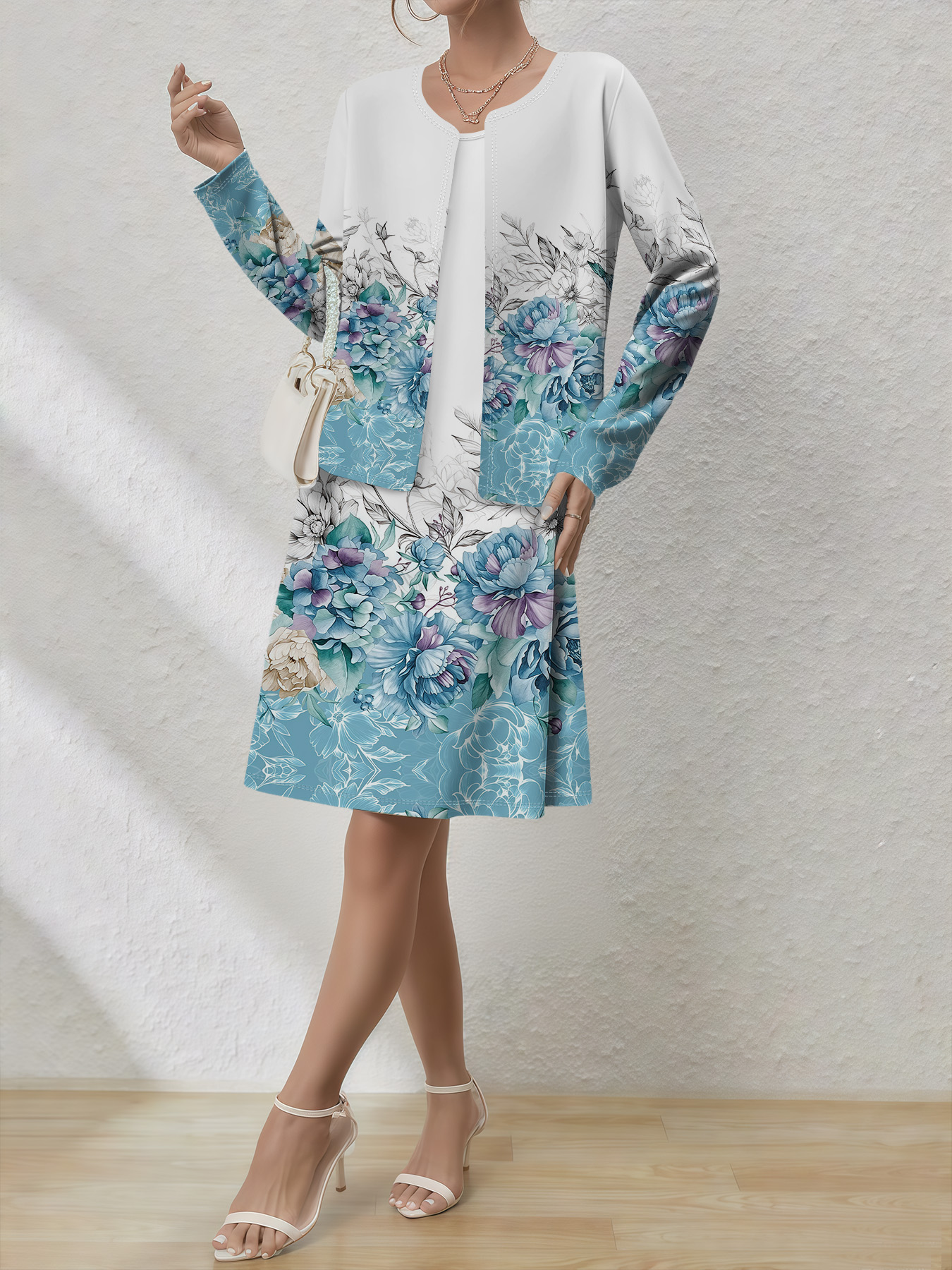 Women's autumn blue floral print cardigan vest dress setWomen’s autumn blue floral print cardigan vest dress set