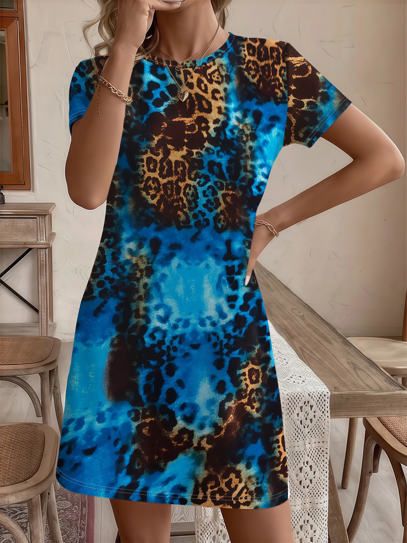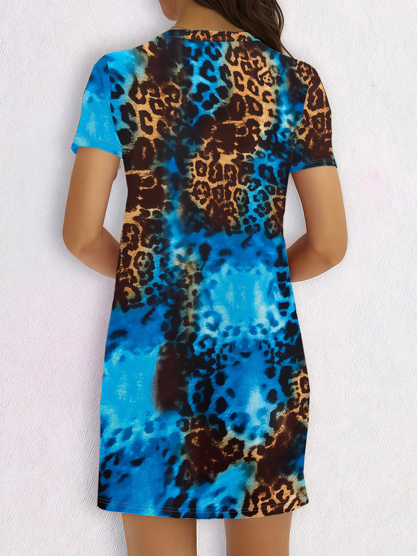 Women's autumn blue leopard print short-sleeved dressWomen’s autumn blue leopard print short-sleeved dress