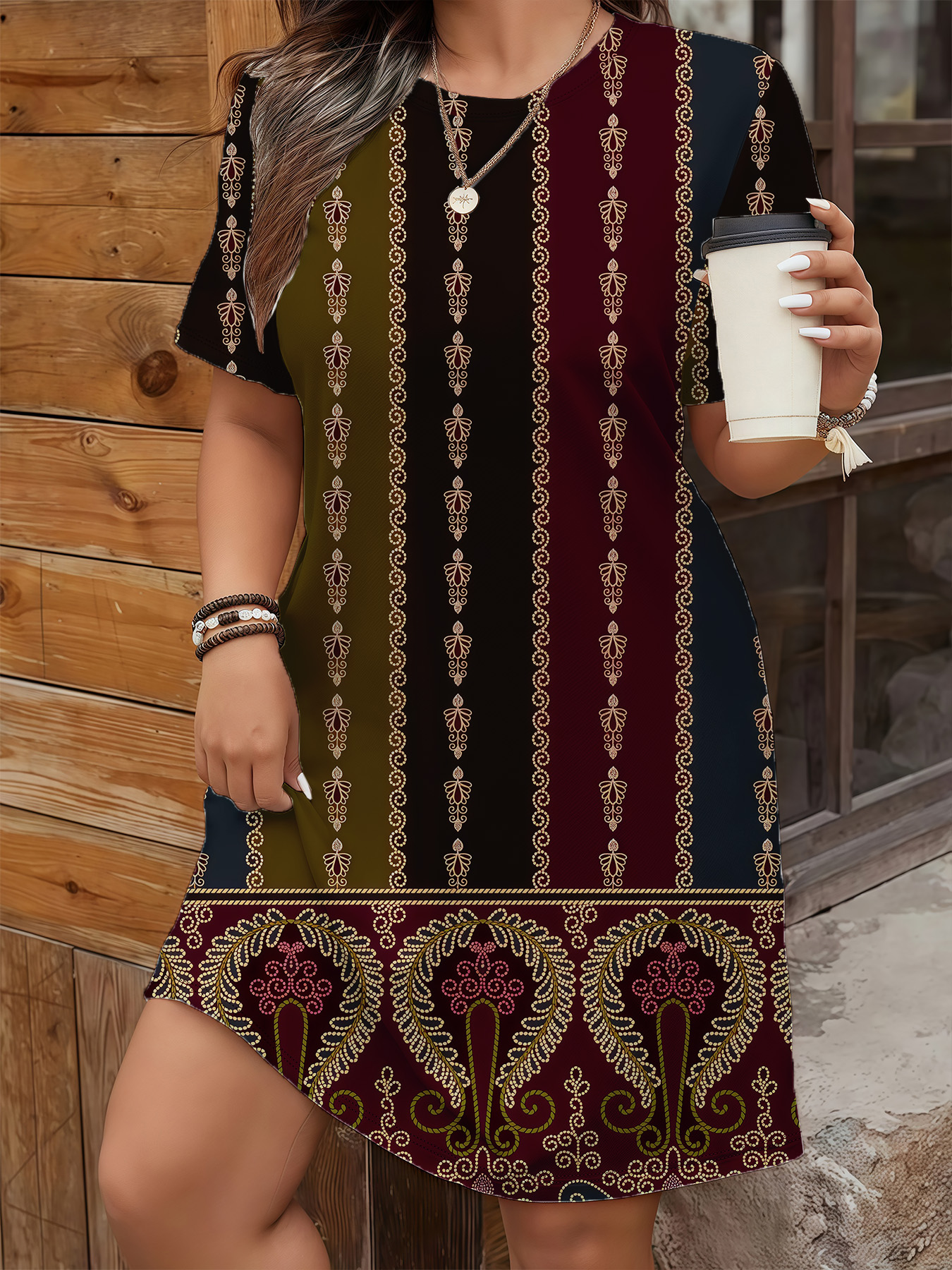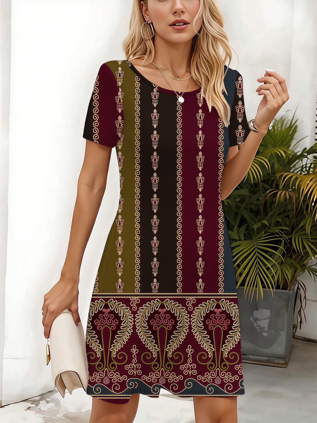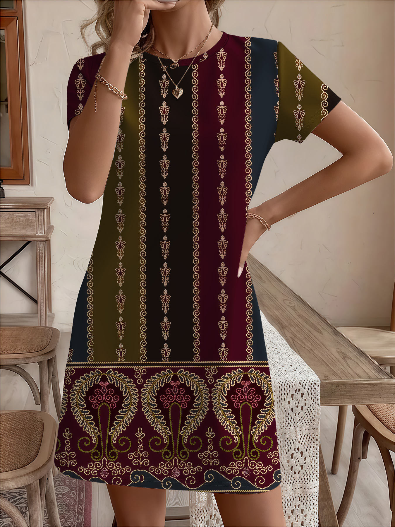 Women’s autumn colorful embroidered and printed short-sleeved dress