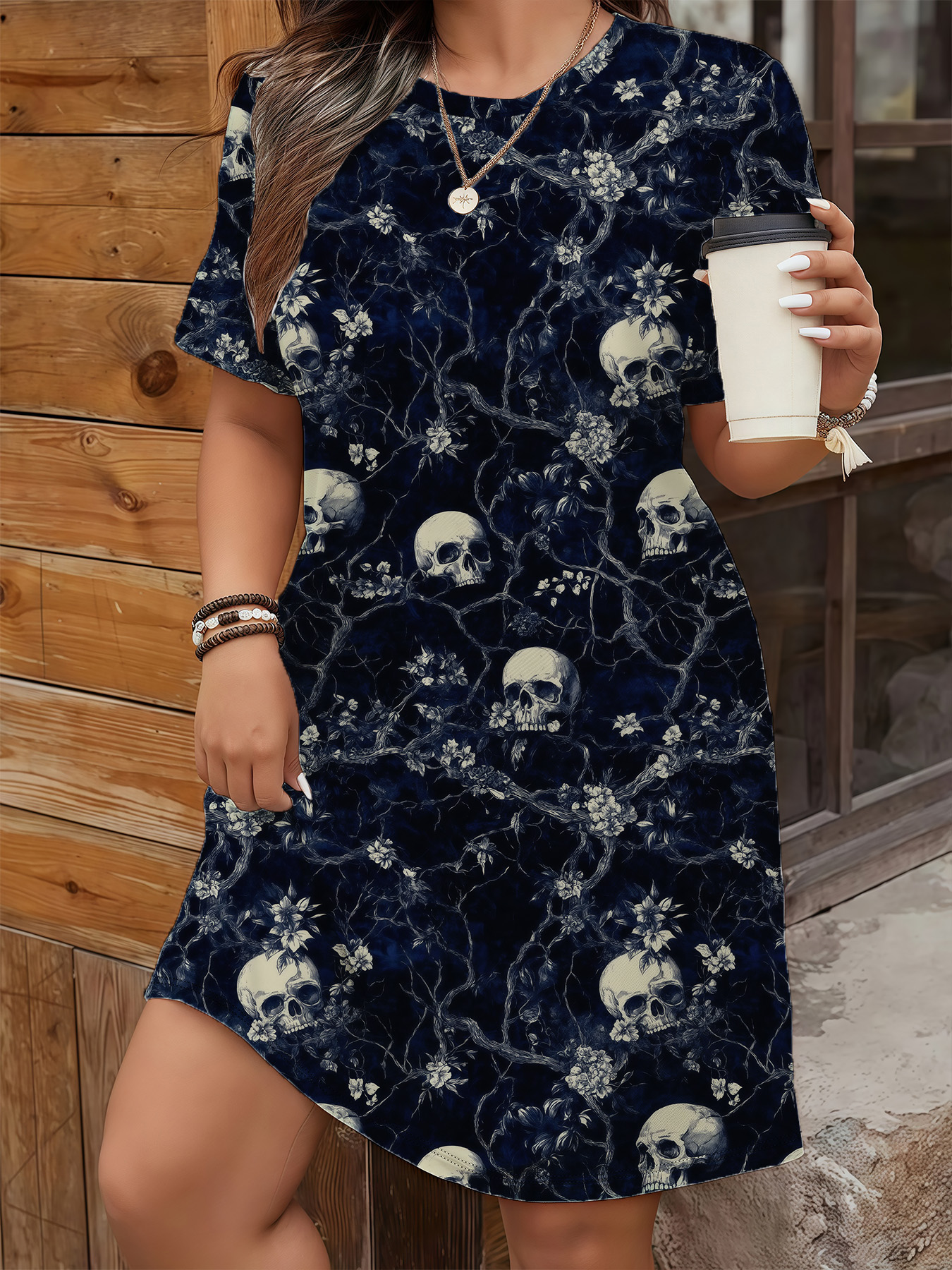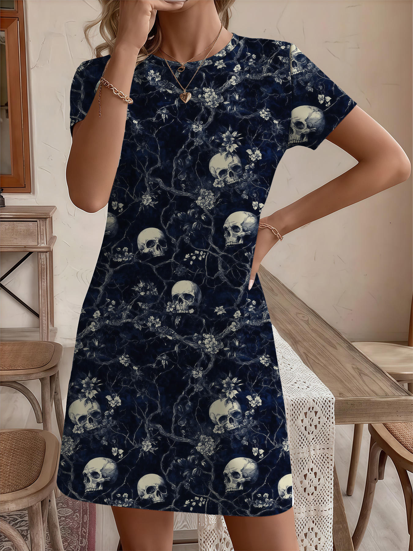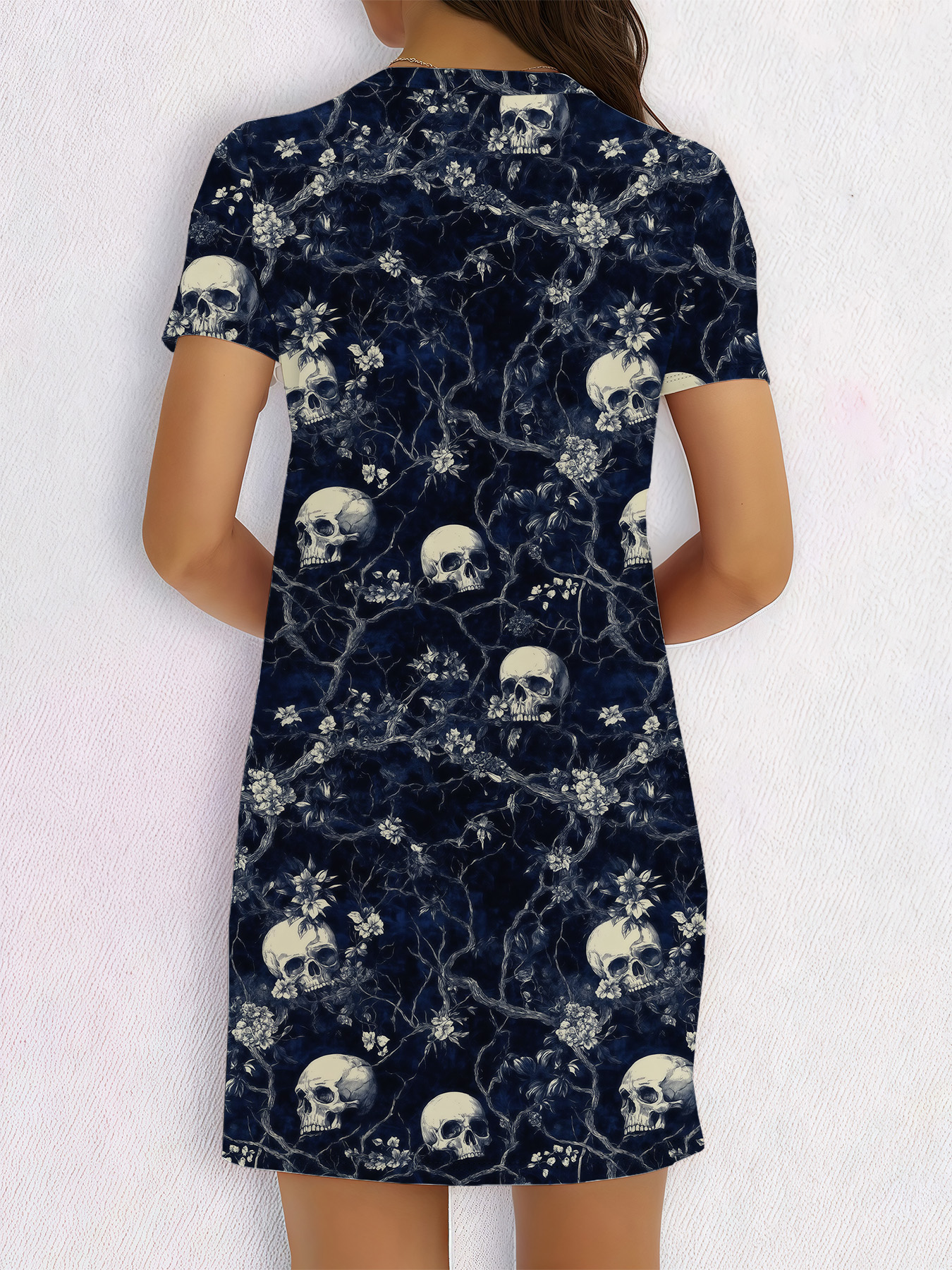 Women's autumn deep blue skull print short-sleeved dressWomen’s autumn deep blue skull print short-sleeved dress
