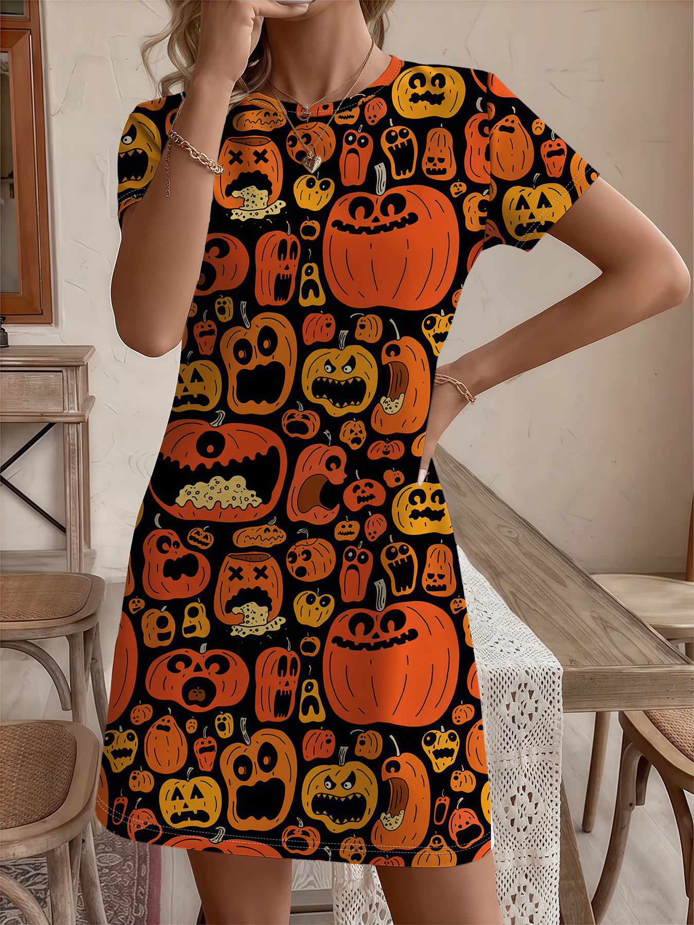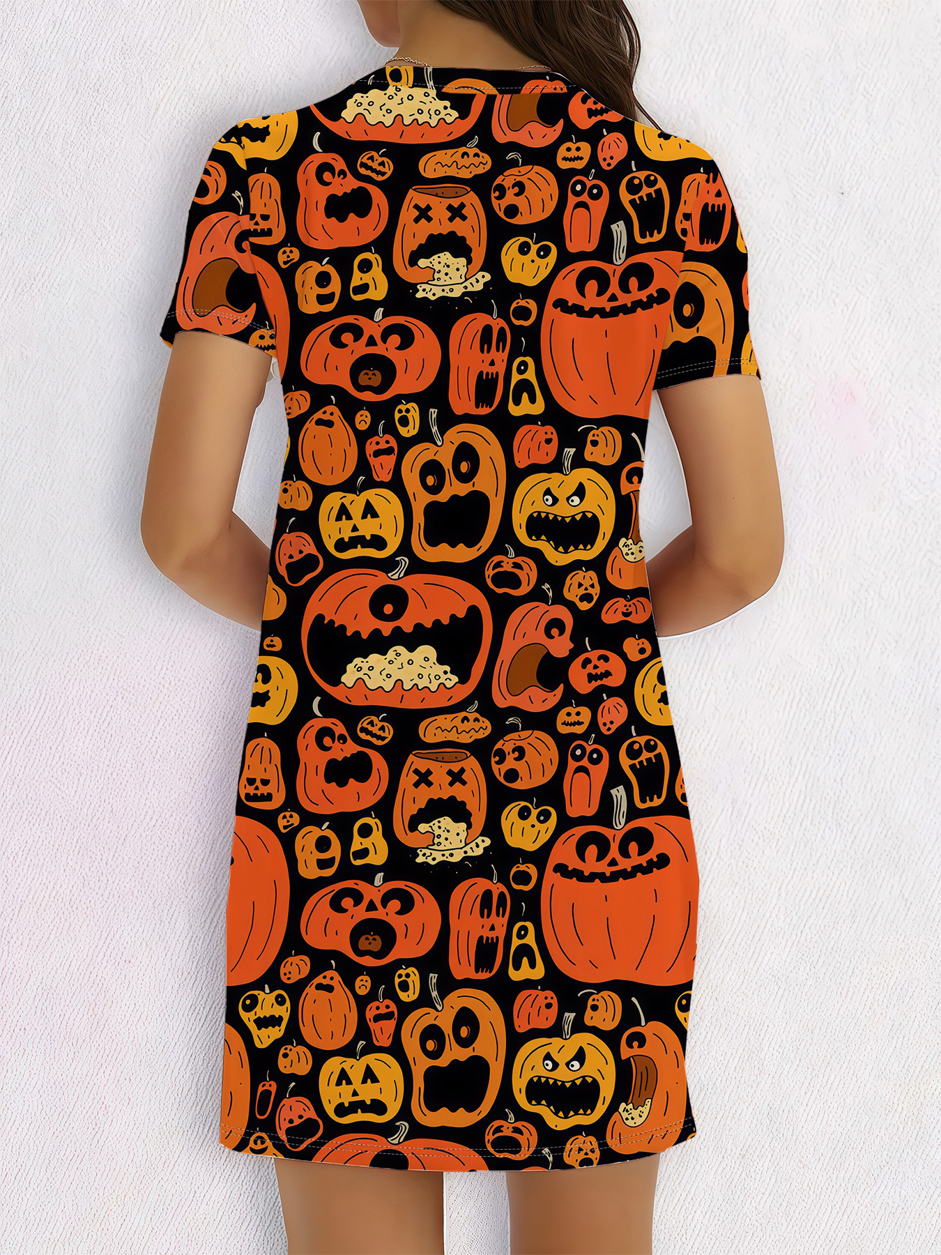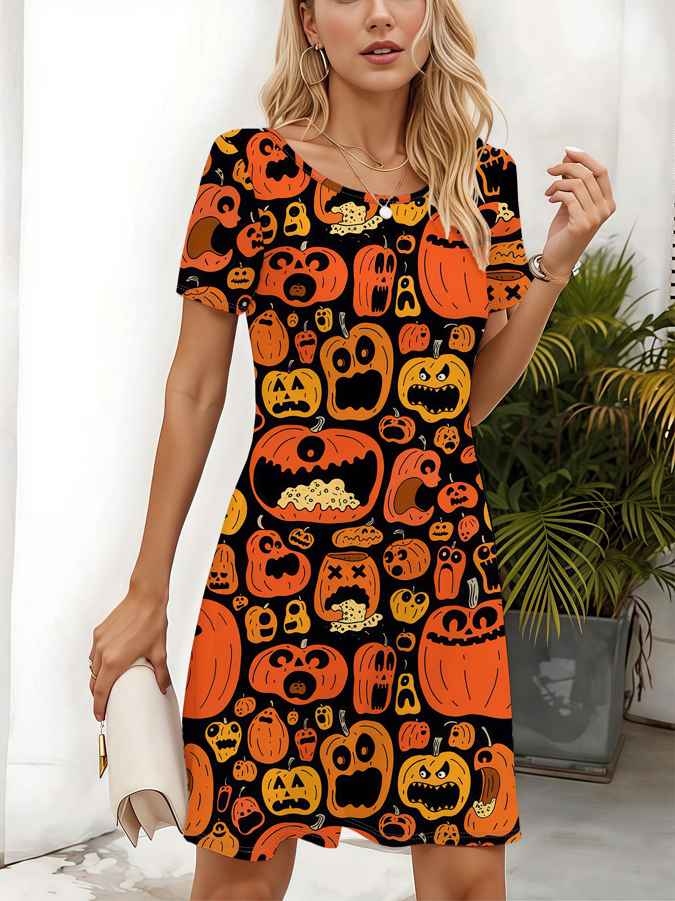 Women’s autumn Halloween pumpkin print short-sleeved dress