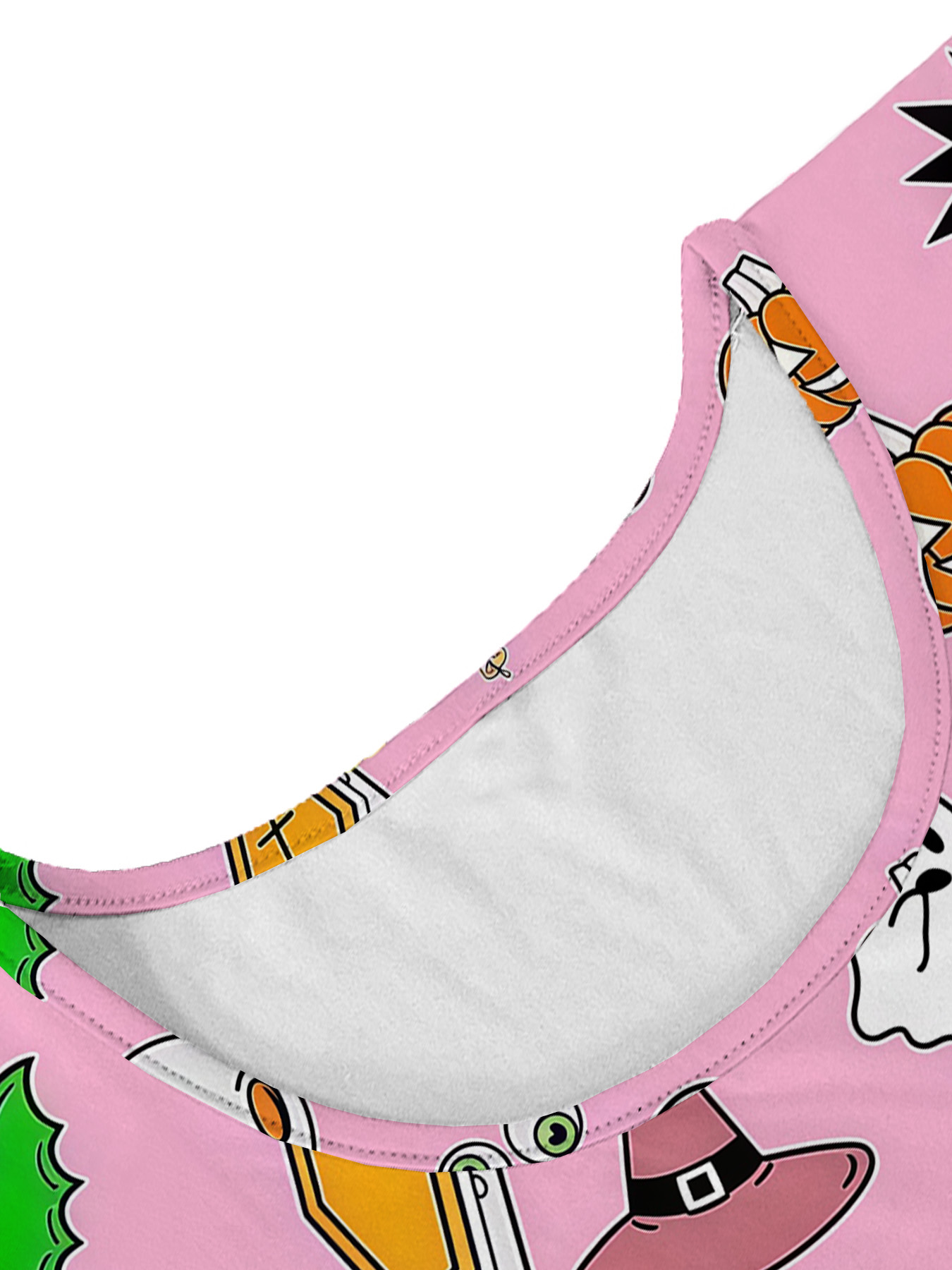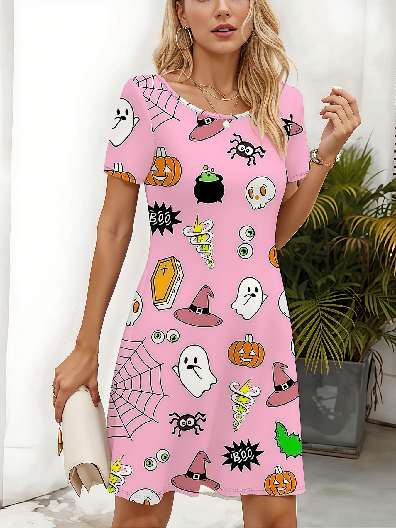 Women’s autumn pink Halloween full-print short-sleeved dress